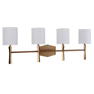 The Chatham Collection featuring white linen shades offset by a rich satin brass finish delivers uncomplicated beauty. Available as a sconce up to a four light vanity, this damp rated collection offers an updated transitional twist to a classic style. White Cylinder Linen Shade 5.25" H x 4.5" W Damp Rated Bulb: 4 x 40W Max, Candelabra Base(Not Included)