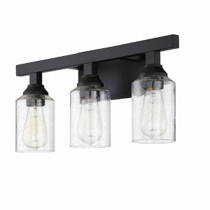 The strong lines and larger scale of the Chicago collection by Craftmade make a bold statement easily at home in any setting. The coordinating clear seeded glass vanities and mini pendant provide excellent lighting options for any bathroom large or small. 1 Year Mounting Direction: Up/Down Shade Included: Yes Material: Steel, Finish Color: Flat Black, Width: 22", Height: 10.25", Length: 22", Depth: 5.75", Height From Outlet Box: 2.63", Backplate Width: 10", Backplate Length: 5.25", Number Of Bulbs: 3, Wattage: 60 Watts, Dimmable: No, Moisture Rating: Damp Rated