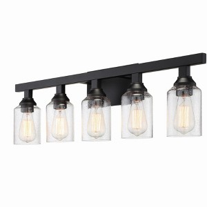 The strong lines and larger scale of the Chicago collection by Craftmade make a bold statement easily at home in any setting. The coordinating clear seeded glass vanities and mini pendant provide excellent lighting options for any bathroom large or small. 1 Year Mounting Direction: Up/Down Shade Included: Yes Material: Glass, Finish Color: Flat Black, Width: 35.75", Height: 10.25", Length: 35.75", Depth: 5.75", Height From Outlet Box: 2.63", Backplate Width: 10", Backplate Length: 5.25", Number Of Bulbs: 5, Wattage: 60 Watts, Dimmable: No, Moisture Rating: Damp Rated