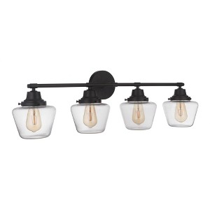 Clear Glass Shades (included) Requires 4 Medium base, 60 watt bulbs (not included) Sturdy Steel Construction Suitable for Damp Locations 1 Year Warranty. 1 Year Mounting Direction: Wall mount Shade Included: Yes Dimmable: Yes Material: Steel, Finish Color: Flat Black, Width: 38", Height: 12.13", Length: 38", Depth: 9", Backplate Width: 5.5", Backplate Length: 1", Number Of Bulbs: 4, Wattage: 60 Watts, Dimmable: No, Moisture Rating: Damp Rated