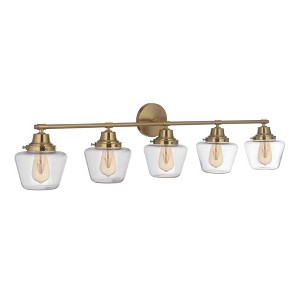 Clear Glass Shades (included) Requires 5 Medium base, 60 watt bulbs (not included) Sturdy Steel Construction Suitable for Damp Locations 1 Year Warranty. 1 Year Mounting Direction: Wall mount Shade Included: Yes Dimmable: Yes Material: Steel, Finish Color: Satin Brass, Width: 48.25", Height: 12.13", Length: 48.25", Depth: 9", Backplate Width: 5.5", Backplate Length: 5.5", Number Of Bulbs: 5, Wattage: 60 Watts, Dimmable: No, Moisture Rating: Damp Rated