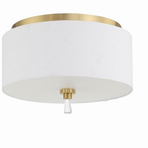 The Fortuna Lighting Collection by Craftmade with optional classic white mini drum shades, satin brass candle sleeves and crystal accents delivers understated elegance and inviting warmth. Flush Mount Indoor Rated Requires 2 Medium Base 60 Watt Bulbs (Not Included) 1 Year Limited Warranty Material: Steel, Finish Color: Satin Brass, Width: 12", Height: 7.87", Length: 12", Lamping Type: Incandescent, Number Of Bulbs: 2, Wattage: 60 Watts,
