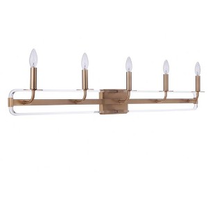 Graceful lines of clear acrylic frames accented with satin brass create the eye-catching Graclyn collection from Craftmade. This updated traditional collection is available in your choice of five or nine light chandeliers, five light foyer, sconce and two to four light vanity fixtures. 60 Watt max, candelabra base bulbs not included. Warm Satin Brass Accented Clear Acrylic Frames Damp Rated Bulb: 5 x 6W Max, Candelabra Base(Not Included)