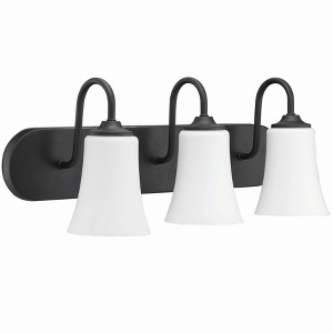 From the delicate contours and smooth flowing lines, to the graceful beauty of the white frosted glass shades, the Gwyneth collection redefines value and style. White Frost Glass Shades (included) Requires 3 Medium base, 100 watt bulbs (not included) Sturdy Steel Construction Suitable for Damp Locations 1 Year Warranty. 1 Year Mounting Direction: Wall mount Shade Included: Yes Dimmable: Yes