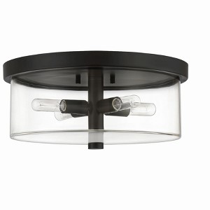 The elevated clear glass cylinder globes and slender arms enhance the simplistic beauty of the Hailie interior lighting collection by Craftmade. The Hailie collection includes a full array of chandeliers, semi and flushmounts, pendant and several sizes of vanity bath bars. Shade Included: Yes Material: Glass, Finish Color: Flat Black, Width: 15", Height: 6.5", Length: 15", Hanging Method: Flush, Lamping Type: Incandescent, Number Of Bulbs: 4, Wattage: 60 Watts, Dimmable: No, Moisture Rating: Dry Rated