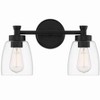 The Henning Collection featuring clear glass delivers uncomplicated simplicity into any bath space. Clear Glass Damp Rated Can be installed up or down Bulb: 2 x 60W Max, Medium Base(Not Included) Material: Glass, Finish Color: Flat Black, Width: 15.75", Height: 9.29", Length: 15.75", Depth: 7.01", Backplate Width: 5", Backplate Length: 5", Lamping Type: Incandescent, Number Of Bulbs: 2, Wattage: 60 Watts, Moisture Rating: Damp Rated