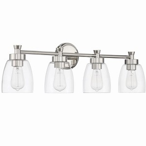 The Henning Collection featuring clear glass delivers uncomplicated simplicity into any bath space. Clear Glass Damp Rated Can be installed up or down Bulb: 4 x 60W Max, Medium Base(Not Included) Material: Steel, Finish Color: Polished Nickel, Width: 30.04", Height: 9.29", Length: 30.04", Depth: 7.01", Backplate Width: 5", Backplate Length: 5", Lamping Type: Incandescent, Number Of Bulbs: 4, Wattage: 60 Watts, Moisture Rating: Damp Rated