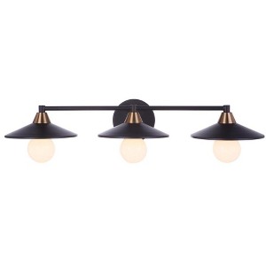 The Isaac Collection by Craftmade with its modern rustic appeal and clean metal dome detail, is offered in five sizes and two finishes - brushed polished nickel and flat black with satin brass accent. Back Plate Height: 5.13 Back Plate Width: 5.13 Material: Steel, Finish Color: Flat Black/Satin Brass, Width: 28.68", Height: 5.13", Length: 9", Depth: 8.9764", Backplate Width: 5.13", Backplate Length: 5.13", Lamping Type: Incandescent, Number Of Bulbs: 3, Wattage: 60 Watts, Dimmable: No, Moisture Rating: Damp Rated