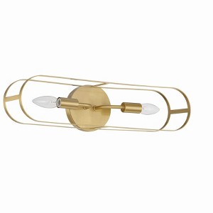 The Mindful Collection's arched open metal frames that mirror the rounded back plates of this sconce collection deliver a sense of art deco glam to this timeless contemporary collection. Open, Glass Free Frame Can be installed vertically or horizontally Coordinates with the Melody Collection Damp Rated Material: Steel, Finish Color: Satin Brass, Width: 20", Height: 5", Length: 20", Depth: 5", Backplate Width: 5", Backplate Length: 5", Lamping Type: Incandescent, Number Of Bulbs: 2, Wattage: 60 Watts, Moisture Rating: Damp Rated
