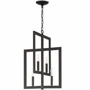 With its bold geometric shapes and candle-style bulbs at varying heights, The Portrait light fixture's multidimensional appeal is hard to deny. Four rectangular pieces layered for effect, the Portrait accurately captures a contemporary style while adding interest to your home's decor. Bold geometric open frame design Requires 4 E12/Candelabra base, 60 watt bulbs (not included) Comes with 6' of Chain 2 Tier Foyer Light Sturdy Steel construction Suitable for Dry Locations 1 Year Warranty. 1 Year Canopy Included: Yes Cord Length: 72.00 Canopy Diameter: 5 x 5 x 1 Dimmable: Yes