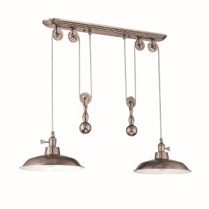 1 Light Pulley Pendant in Aged Bronze Brushed Features: Product Type: Indoor Ceiling Lighting - Pulley Pendant Finish: Aged Bronze Brushed Bulb Included: No Bulb Type: Incandescent Material: Steel Warranty: 1 Year Material: Metal, Finish Color: Tarnished Silver, Width: 38.25", Height: 12", Length: 12", Hanging Method: Cord, Number Of Bulbs: 2, Wattage: 200 Watts, Dimmable: No, Moisture Rating: Dry Rated