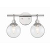 Make a statement with the striking silhouettes of the Que collection. Clear seeded glass globes in updated silhouettes offer a fresh look to brighten your home. Clear Seeded Glass Shades (included) Requires 2 Candelabra base, 40 watt bulbs (not incl 1 Year Mounting Direction: Up/Down Shade Included: Yes Material: Glass, Finish Color: Chrome, Width: 14.5", Height: 10.5", Length: 14.5", Depth: 7.25", Height From Outlet Box: 2.5", Backplate Width: 5", Backplate Length: 5", Number Of Bulbs: 2, Wattage: 40 Watts, Dimmable: No, Moisture Rating: Damp Rated