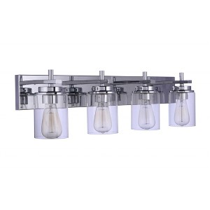Modern, architectural details combine with clear glass cylinder shades and a smooth wide back plate, to create the Reeves Vanity Collection. Available in two finishes, the Reeves offers your choice of a wall sconce single light up to a 5 light vanity. Wall Mount Damp Rated Requires 4 Medium Base 60 Watt Bulbs (Not Included) 1 Year Limited Warranty