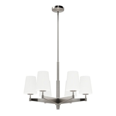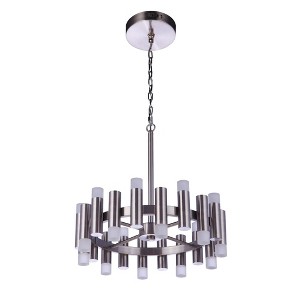 The Simple Lux Lighting Collection by Craftmade features brilliant dimmable LED light illuminating the frosted glass shades of this contemporary collection of 16", 20" and 27" diameter chandeliers and 12" diameter semi flushmount fixture. Sleek cylinders with frost LED caps alternating up and down surround the round frame suspended from a round canopy by a combination of rod and adjustable height chain. Damp Rated LED - Color Temp: 3K (Dimmable), CRI: 9 Frosted Acrylic Dimmable LED, 3K, CRI 9