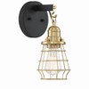 Fashion meets industrial. The open-air design of the metal wire shades showcases the warehouse look of the Thatcher collection. Adding an early electrib bulb will enhance the appeal of the vintage design. Satin Brass Steel Cage (included) Requires 1 Medium base, 100 watt bulbs (not included) Sturdy Steel Construction Suitable for Damp Locations 1 Year Warranty. 1 Year Mounting Direction: Wall mount Shade Included: Yes Dimmable: Yes