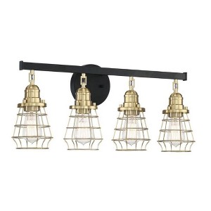 Fashion meets industrial. The open-air design of the metal wire shades showcases the warehouse look of the Thatcher collection. Adding an early electrib bulb will enhance the appeal of the vintage design. Satin Brass Steel Cages (included) Requires 4 Medium base, 100 watt bulbs (not included) Sturdy Steel Construction Suitable for Damp Locations 1 Year Warranty. 1 Year Mounting Direction: Wall mount Shade Included: Yes Dimmable: Yes