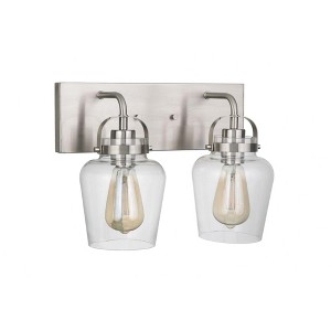 The functional minimalism of the Trystan collection with it's eye-catching silhouettes and clear glass captured globes offers innovative lighting without overwhelming your decor. Clear Glass Shades (included) Requires 2 Medium base, 60 watt bulbs (n 1 Year Mounting Direction: Up/Down Shade Included: Yes Material: Steel, Finish Color: Brushed Polished Nickel, Width: 14", Height: 10", Length: 14", Depth: 7.5", Height From Outlet Box: 2.4", Backplate Width: 14", Backplate Length: 4.75", Number Of Bulbs: 2, Wattage: 60 Watts, Dimmable: No, Moisture Rating: Damp Rated