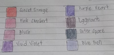 A: Thanks for your colorful query! The 120 ct. Crayons box includes the following iconic hues: almond, antique brass, apricot, aquamarine, asparagus, atomic tangerine, banana mania, beaver, bittersweet, black, blue, blue bell, blue green, blue violet, bluetiful, blush, brick red, brown, burnt orange, burnt sienna, cadet blue, canary, caribbean green, carnation pink, cerise, cerulean, chestnut, copper, cornflower, cotton candy, denim, desert sand, eggplant, electric lime, fern, forest green, fuchsia, fuzzy wuzzy brown, gold, goldenrod, granny smith apple, gray, green, green yellow, hot magenta, inchworm, indigo, jazzberry jam, jungle green, laser lemon, lavender, macaroni and cheese, magenta, mahogany, manatee, mango tango, maroon, mauvelous, melon, midnight blue, mountain meadow, navy blue, neon carrot, olive green, orange, orchid, outer space, outrageous orange, pacific blue, peach, periwinkle, piggy pink, pine green, pink flamingo, pink sherbert, plum, purple heart, purple mountains’ majesty, purple pizzazz, radical red, raw sienna, razzle dazzle rose, razzmatazz, red, red orange, red violet, robin’s egg blue, royal purple, salmon, scarlet, screamin’ green, sea green, sepia, shadow, shamrock, shocking pink, silver, sky blue, spring green, sunglow, sunset orange, tan, tickle me pink, timberwolf, tropical rain forest, tumbleweed, turquoise blue, unmellow yellow, violet (purple), violet red, vivid tangerine, vivid violet, white, wild blue yonder, wild strawberry, wild watermelon, wisteria, yellow, yellow green, yellow orange Happy creating!