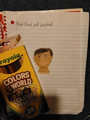I can't even put into words how healing, exciting, and heartbreaking(that it took so long) this was to draw. It was so uplifting to see all the different browns as I tried them all out. I kept saying "I think that's my brown..oh maybe this one's my brown!" After all if them were layed out I picked out my skin color, then my hair color, then my eye color..all are different shades of brown. Thank you Crayola for finally making more brown options besides simply brown and tan(neither are me) my inner child is screaming with joy!