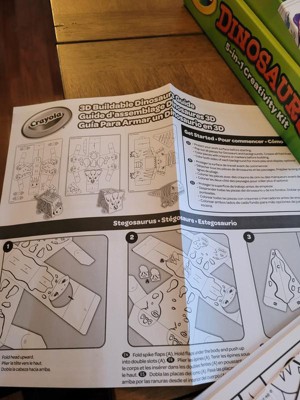 [This review was collected as part of a promotion.] My 4 year old was over the moon when she saw this kit! It came with everything she needed to get lost in a little dino world for quite a while. She especially loved coloring the 3d characters and creating a diorama with them and the backgrounds. The backgrounds need a bit of reinforcement to stand up, the feet didn't quite support their weight. Overall this was a huge hit!