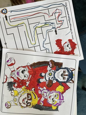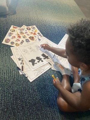 [This review was collected as part of a promotion.] Kid loves paw patrol Pros: It brings 5 different markers with the main colors for the cloths of the dogs and many pages to color and fun little puzzles and games for learning. When the kid finishes painting, they can turn the page and play with a puzzle/game on the other side. Fun for kids and adults alike. Cons: The title is color and sticker, which we hoped it was you color the stickers and then you would stick them anywhere you like, however the stickers are already painted and the fun of the coloring is for the rest of the pages. Only 5 colors so you need crayons or other markers to finish coloring the dogs.