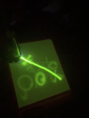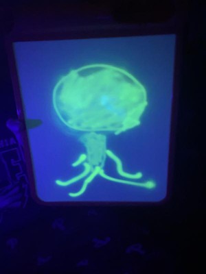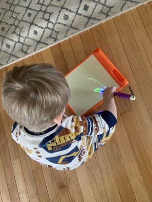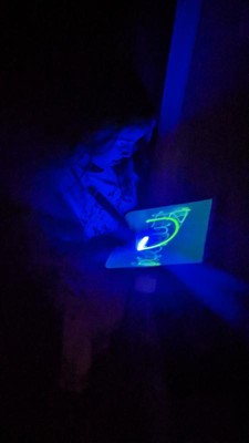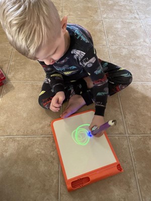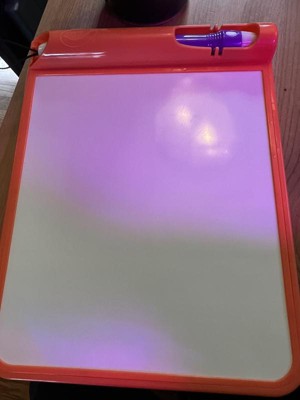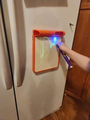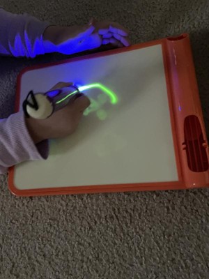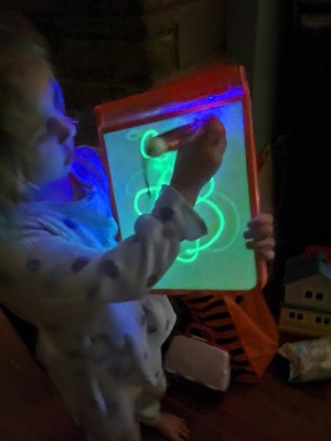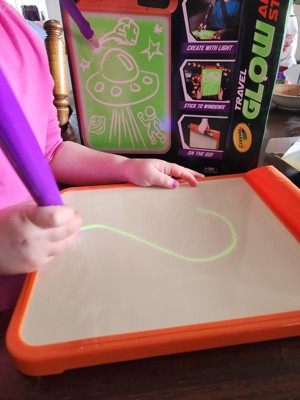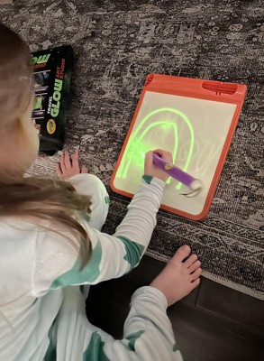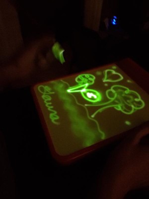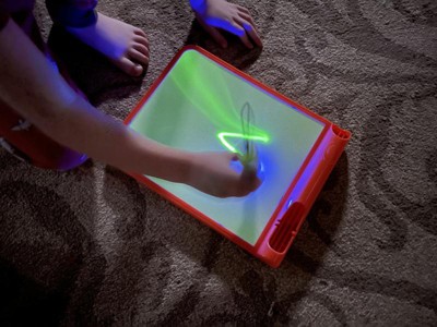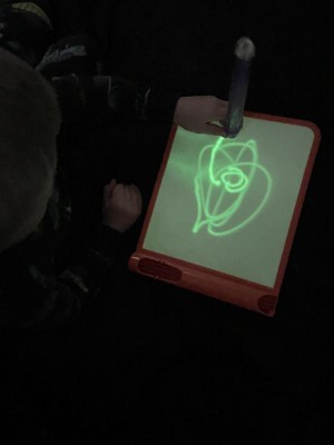 [This review was collected as part of a promotion.] This was a hit with all 3 of my kids (ages 11, 8, and 4). My 8 and 4-year-olds particularly enjoy using it and like to play with it for a few minutes after lights out in the evenings. I always worry that glow products like this won't be very vibrant, but this one actually glowed pretty brightly. The kids liked that they could change the boldness of the glowing lines by moving the glowing pen closer to or farther away. Their only complaint was that there is no way to erase a drawing. You have to have the patience to wait a minute or two for one picture to fade before you can draw another one.