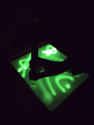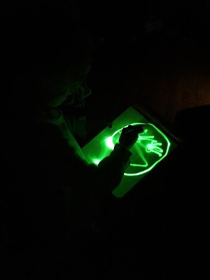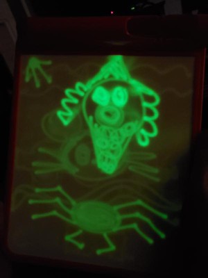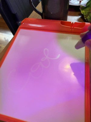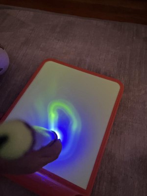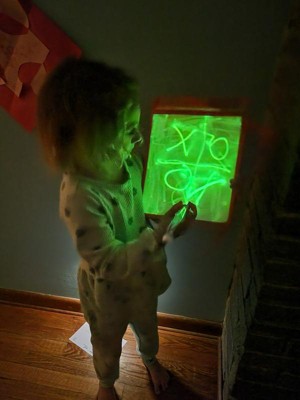 [This review was collected as part of a promotion.] My 5 year old daughter was super excited about trying this. It surpassed our expectations and now I need to purchase 2 more!! Just put in the batteries and draw!(some how we overlooked this at first) Will be great for dark car rides and my son if he's at a sleepover and can't rest. The color is really bright and reminds me of a doodle board but for the dark. Will also be a fun way to introduce my youngest into writing letters and words. I can't say enough positive things!