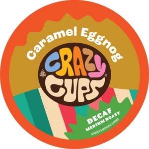 Crazy Cups Decaf Caramel Eggnog Flavored Coffee PodsSleigh the Day with Decaf Caramel Eggnog DelightOur Caramel Eggnog decaf coffee brings together the comforting taste of eggnog with the luxurious sweetness of caramel and vanilla. Add in a whisper of rum flavor, and you've got coffee that's pure holiday magic without the caffeine! Perfect for brewing hot or serving over ice, any time of day.100% Arabica Beans, Medium Roast, Flavored with a Blend of Natural and Artificial Flavors.Treat yourself to the creamy, dreamy taste of Caramel Eggnog Decaf coffee, and make any moment a holiday moment without the caffeine jingle.