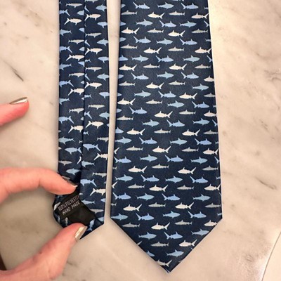 [This review was collected as part of a promotion.] This is the perfect tie for any fisherman. I bought this tie for my dad who loves to go fishing, and is now retired and spends even more time fishing. The tie is made of polyester, so it’s not a high-end fabric but he doesn’t really need that anyway. I would say it is worth the price because of how well it is made, and I was surprised to see its hand made. The shark pattern is not obnoxious, and is a pattern that won’t even be noticed until you’re up close. Blue is a classic tie color, so will certainly get used. This was a great purchase.