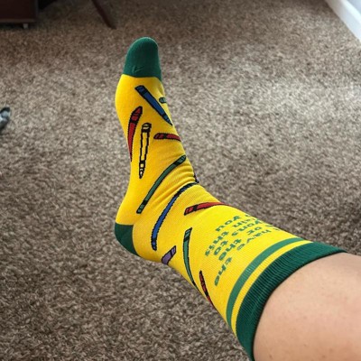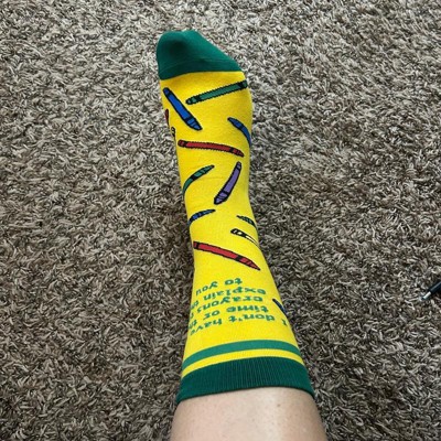 Crayon Print with Attitude: Covered in playful red, green, purple, and yellow crayons on a vibrant yellow background; eye-catching and expressive novelty socks designed for women who love quirky, bold, and sassy graphic prints