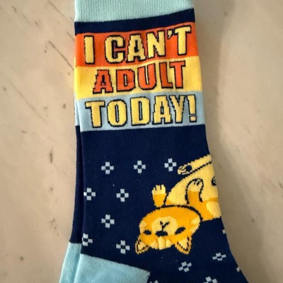 Bold & Relatable Quote: Features the phrase “I Can’t Adult Today” with a sleeping orange cat graphic on blue crew socks; a hilarious way to show the world you’re not emotionally available for grown-up responsibilities today