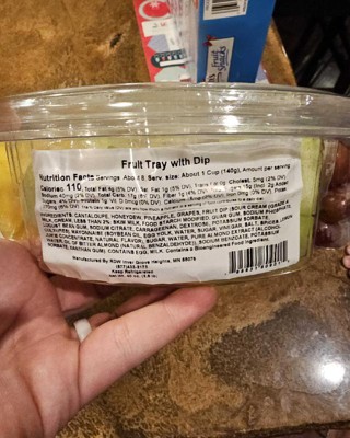 cantaloupe, honeydew, pineapple, strawberries, fruit dip (cream cheese (pasteurized cream and skim milk, lactic acid, salt, gums (locust bean, guar and xanthan gum), marshmallow creme (high fructose corn syrup, corn syrup, water, sugar, modified corn starch, less than 2% of: glycerin, color added, egg white, sodium citrate, xanthan gum, potassium sorbate (preservative), artificial flavors), water, lemon juice (water, lemon juice from concentrate, citric acid, sodium benzoate and sodium bisulfite as preservatives, lemon oil), sugar, vanilla flavor (water, caramel color, vanillin, ethyl vanillin, and potassium sorbate (preservative)), modified food starch, sodium benzoate (preservative), sorbic acid, cultured grade a skim milk & skim milk, stabilizer (guar gum, xanthan gum), caramel color, yellow color (propylene glycol, polysorbate 80, turmeric oleoresin and annatto extract)).' '