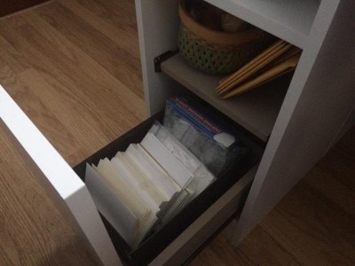 The narrow storage spaces can be accessed from either side, so this table can be placed in a corner. Metal drawer slides for a smooth gliding