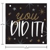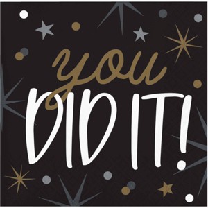 - Napkins feature "you did it!" text accented by stars in a black, white, silver, and gold design