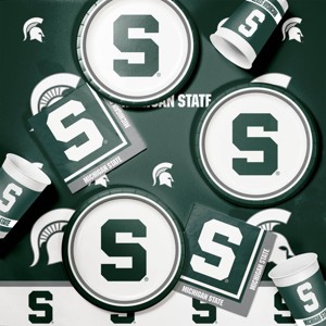 Each Michigan State University Tailgating Kit contains: 8 Michigan State University Paper Plates, 20 Michigan State University Napkins, 8 Michigan State University Plastic Cups and 1 Michigan State Plastic Tablecover. Use these Spartans plates, napkins and cups to show love for your team. This Michigan State University tailgating kit lets you party in style while you wait for the big game with all of your fellow Spartans fans. Go Sparty!