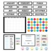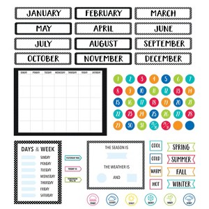 This 67-piece classroom calendar set includes a calendar chart, 12 month headlines, 33 pre-numbered calendar days, and 2 blank calendar days. The set also includes a days-of-the-week chart, a seasons and weather chart, and coordinating labels.