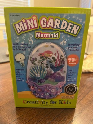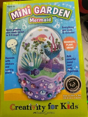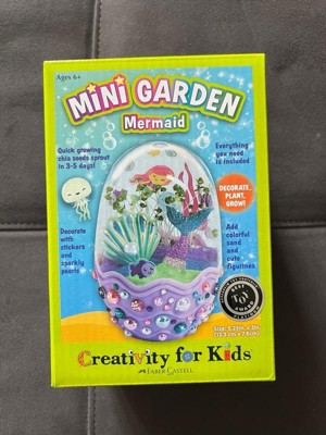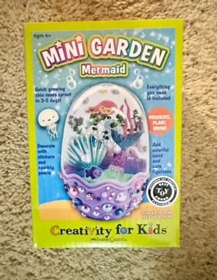 Decorate, plant and grow your own mini garden in an egg-shaped environment with the Creativity for Kids Mini Garden - Mermaid. This complete indoor gardening kit for kids combines the fun of arts and crafts with science and learning for a unique STEAM experience. Growing your own garden is a great activity that helps develop responsibility, independence and creative confidence. Quick grow Chia seeds make gardening easy with immediate results in 3-5 days. Everything you need is included, just add imagination and water! This mermaid craft kit includes potting mix, quick growing Chia seeds, themed stickers, dimensional accents, fun mini figures (mermaid tail and shell) and decorative sand (blue, green and purple). Finished Creativity for Kids Mermaid garden measures 5 1/4 "H x 3" W and is recommended for ages 6 to 96.