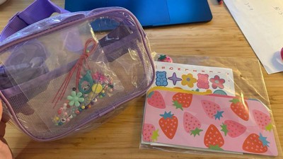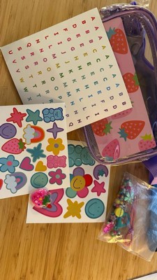 - This all-in-one kit includes a clear belt bag, 2 double-sided patterned inserts, sticker sheets, alphabet letter stickers, colorful beads, a teal lobster clasp, beading string, and a strawberry puff shaker sticker
