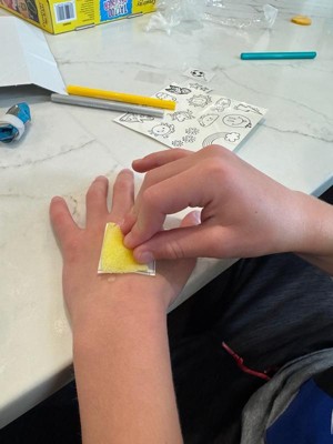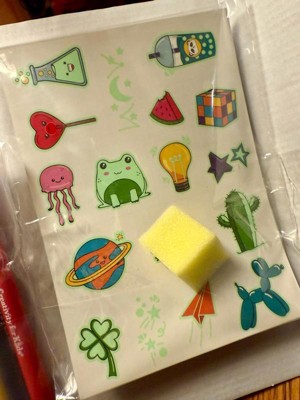 [This review was collected as part of a promotion.] This activity was so fun! You get 2 sheets of temporary tattoos: 1 sheet is metallic and 1 sheet glows in the dark. There’s a 3rd sheet that you can color in yourself with the markers enclosed. It also has a sponge to help transfer tattoos. My son really enjoyed this activity!
