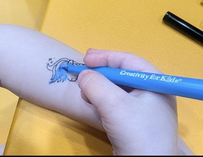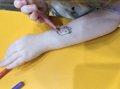 [This review was collected as part of a promotion.] My girls absolutely love this! It was a nice fun craft they could do on their own once the tattoo was applied. Once the ink dried after it they colored it in didn't smudge or rub off unless you were trying to get it off. With that said it wasn't hard to get off either. The markers were just the right size for both my 3 and 5 year old. They had a large variety of colors for them to use their creativity. Highly recommend for a fun quick activity.