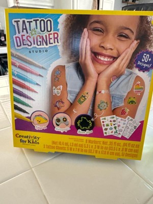 [This review was collected as part of a promotion.] My 6 year old daughter loves temporary tattoos so she was excited to try out the tattoo designer studio. It comes with 8 brush tip markers vivid in color and at least 50 different tattoo designs, some of which are glow in the dark. They had the right idea when they printed lines on the back of the sheets of tattoos to help guide you when cutting them out, especially for my 6 year old. No mess activity and they are easy to take off with a little soap and water. She loved coloring and applying the tattoos and I loved that it was a great activity we could do together that fosters her creativity and imagination!
