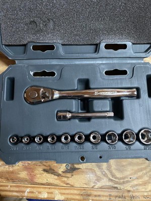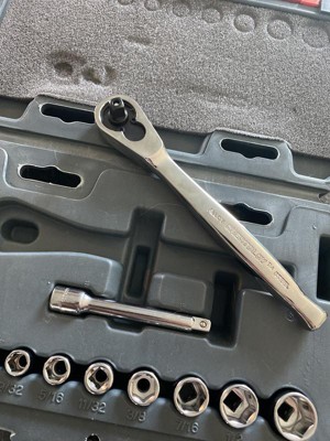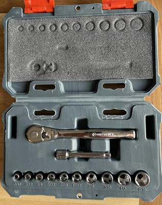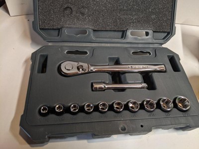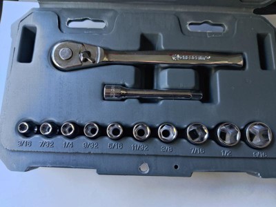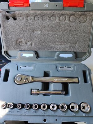 [This review was collected as part of a promotion.] This is a great small socket set to keep in my work van for when I need something small or compact. It has sockets from 3/16 to 9/16 and it came with a 3" extension and the hard case seems very durable.
