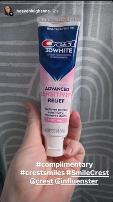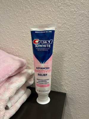 [This review was collected as part of a promotion.] I absolutely love the crest 3D white advanced sensitivity relief soft mint toothpaste. Since I’ve been using this toothpaste my teeth are so much more bright add brushing my teeth doesn’t hurt anymore. My breath smells good. This is the perfect toothpaste for sensitive skin and cavity protection. I love that the tube of the toothpaste stands up so it doesn’t fall over. I highly recommended this product to anyone.