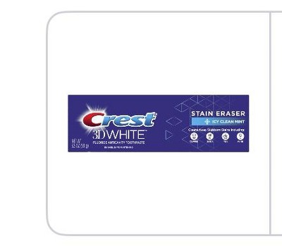 Brighten your smile with Crest 3D White Stain Eraser Toothpaste in Icy Clean Mint flavor. This Crest toothpaste helps to remove 80% more surface stains* caused by tea, coffee, soda, wine, and other beverages. This formula is gentle on enamel and helps protect against cavities while leaving breath minty fresh. *Vs regular toothpaste. From America's #1 Whitening Brand.* *P&G calculation based on U.S. reported sales data for year ending w/o 6/11/2022.