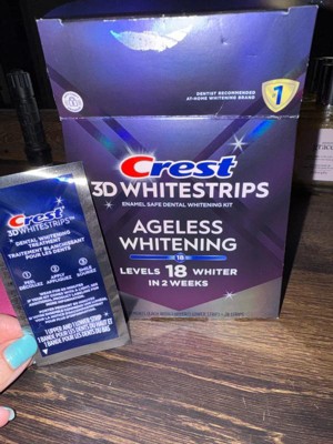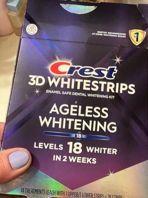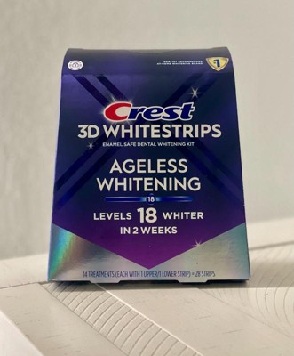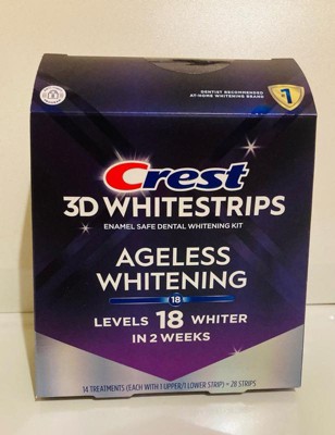Turn back time with Crest 3DWhitestrips Ageless Whitening: this kit removes 30 years of stains in 2 weeks! Brought to you by the #1 dentist-recommended at-home teeth whitening brand* this kit will make your teeth 18 levels whiter to restore your most brilliant smile. The Advanced Seal Technology's no-slip grip means the strips stay put until you take them off, allowing you to talk and even drink water while whitening your teeth. Crest 3DWhitestrips Ageless Whitening is an enamel-safe, at-home teeth whitening kit, using the same whitening ingredient as dentists. Simply apply Crest 3DWhitestrips Ageless Whitening for 60 minutes a day for 14 days. This pack includes 28 teeth whitening strips, 14 for your top teeth and 14 for your bottom teeth, to be used over the course of 14 days.*In a survey of over 500 dentists from Jan 12th-April 2023