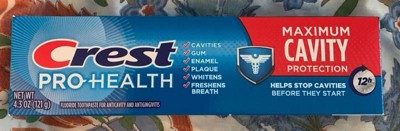 [This review was collected as part of a promotion.] Crest prohealth, Max cavity, protection, toothpaste, gives me a sense of comfort, knowing that my teeth are protected from cavities. The texture is not gritty at all, and leaves my teeth filling fresh all day long.
