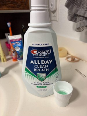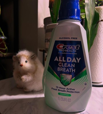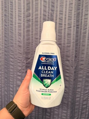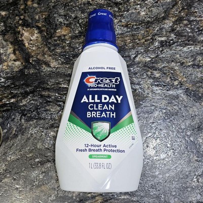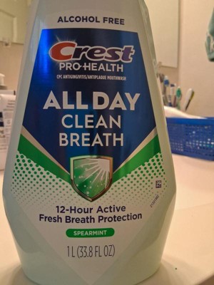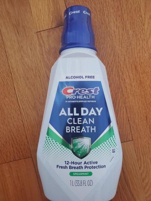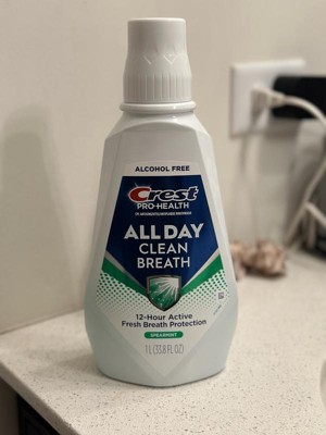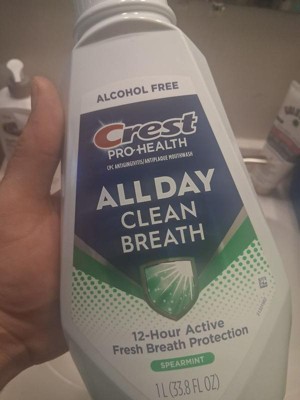 [This review was collected as part of a promotion.] I absolutely love this Crest Pro-Health All Day Clean Breath mouthwash! The spearmint flavor is refreshing without being overpowering, and I really appreciate that it’s alcohol-free—no burning sensation at all. My mouth feels clean and fresh for hours, and it truly lives up to the 12-hour fresh breath claim. It’s gentle enough to use daily but still effective at keeping my breath fresh and my mouth feeling healthy. The large bottle lasts a long time, making it a great value. This has become a staple in my oral care routine, and I highly recommend it to anyone looking for long-lasting freshness without the harshness of alcohol.
