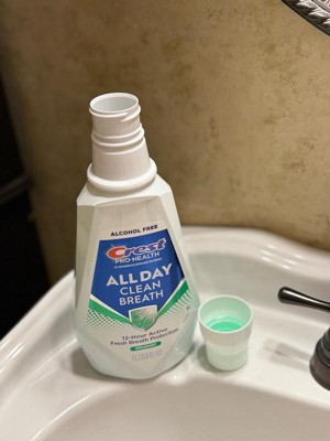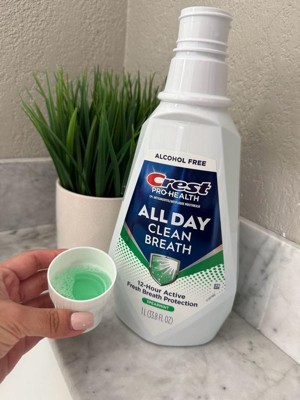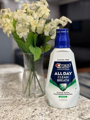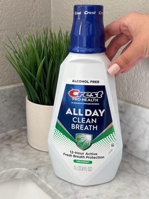 Crest Pro-Health All Day Clean Breath Mouthwash delivers a powerful 100% whole mouth clean without the harshness of alcohol. Enjoy up to 12 hours of fresh breath protection with every rinse, thanks to the refreshing Spearmint flavor that leaves your mouth feeling clean and invigorated. Whether you're starting your day or winding down, Crest Pro-Health helps you feel confident and protected.