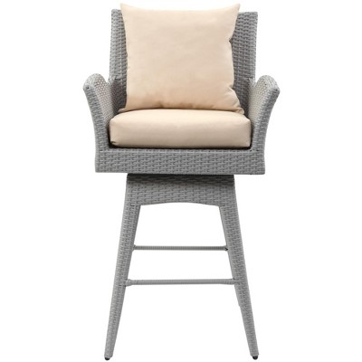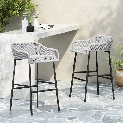 Crestlive Products 26.8'' Counter Height Set of 4 Outdoor Bar Stools Mental Frame with Wood-Like Back and Cushions Light Gray