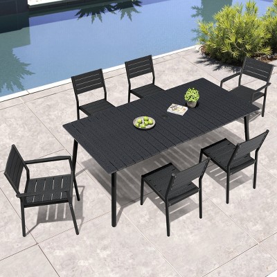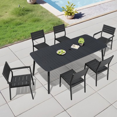 Crestlive Products 7pc Outdoor Dining set 82in Patio Rectangle Table with Rattan Dining Chairs Aluminum Frame Wood-Like Tabletop Umbrella Hole Gray